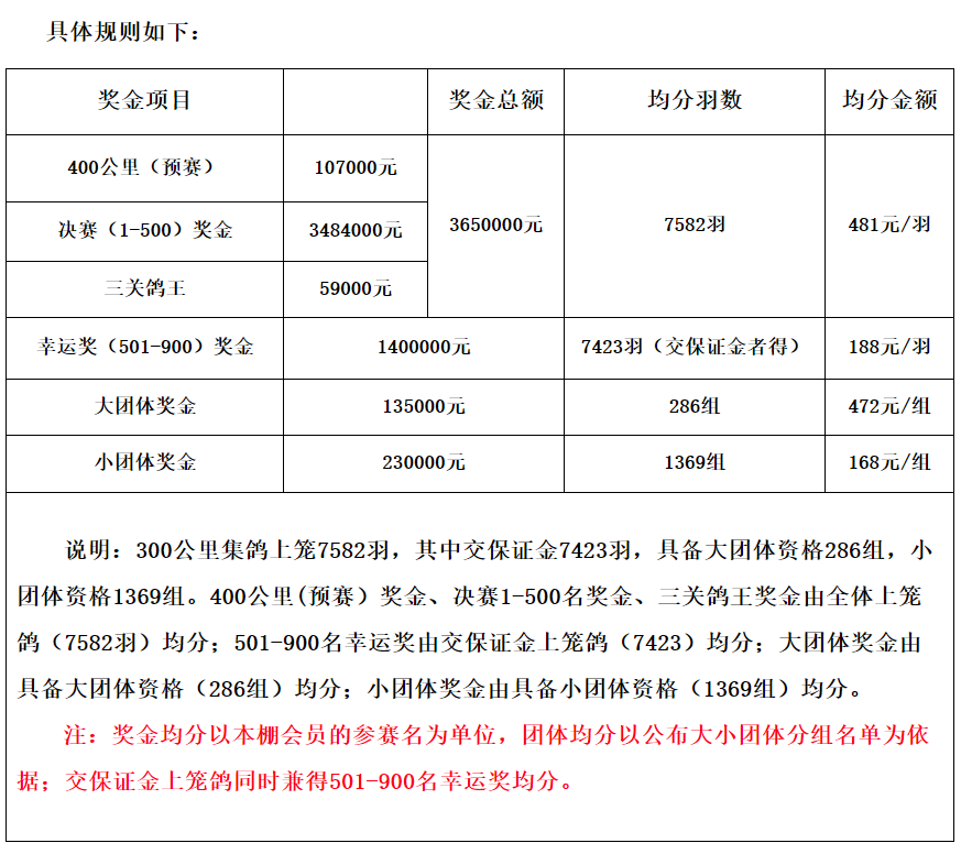 由于归巢羽数不足,本公棚决定取消本届比赛,归巢参赛鸽领回。按照本届赛事规程,剩余奖金由本关上笼鸽均分。本届赛事总奖金为5472000元,其中300公里(资格赛)奖金:57000元产生并已发放,剩余5415000元由300公里上笼鸽均分相应项目奖金;精英赛报名费原数退回。