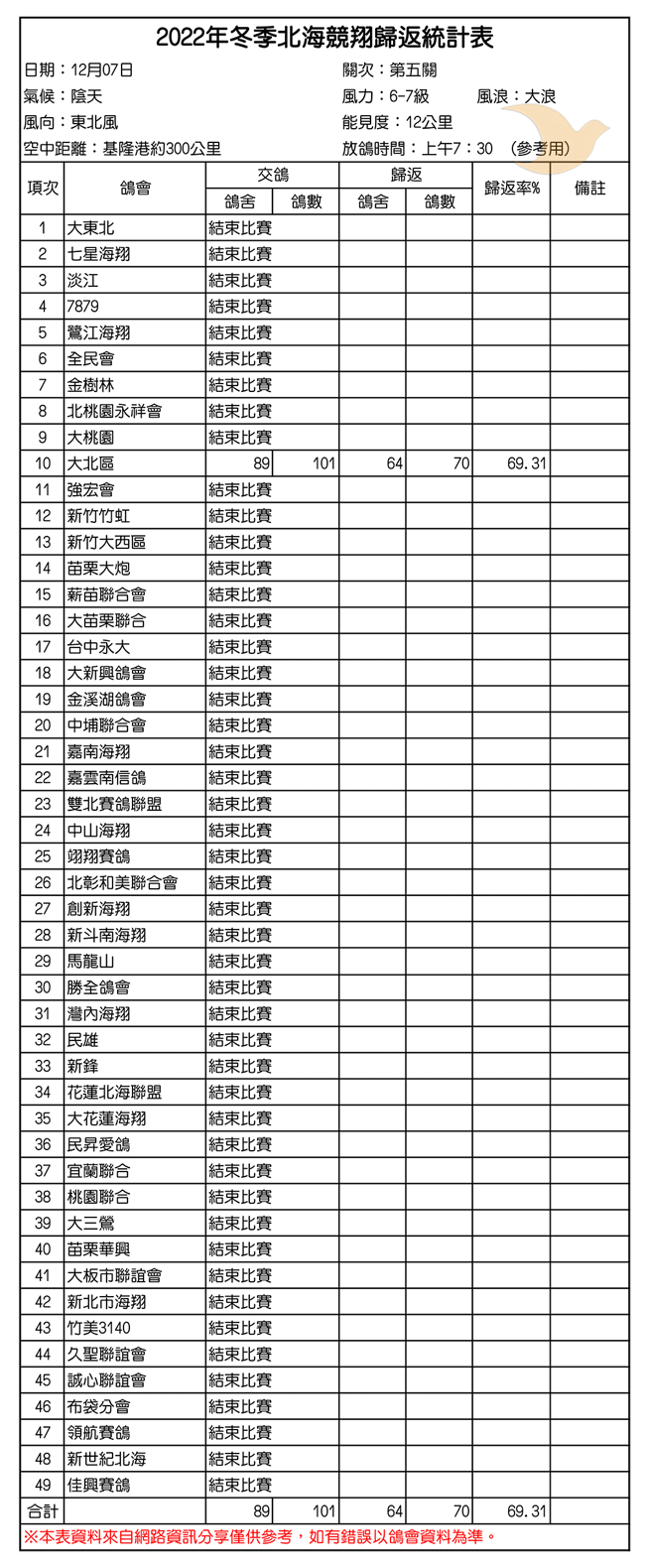 2022年中国台湾北海冬季五关海翔赛第五关比赛,于12月7日早上7点30分在基隆港出海300公里处放飞,天气阴天,东北风6-7级,大浪,能见度12公里。
