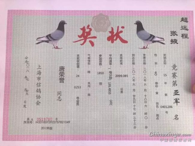 2018年上海市信鸽协会举办张掖超远程赛事,2099公里,1850羽参赛鸽,有效归巢22羽,归巢率1.19%,是历史最低归巢率。