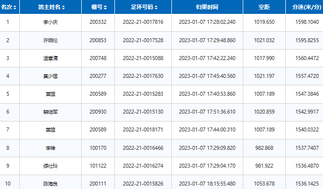 继首羽鸽归巢后,其它赛鸽也陆续归来。下午17点29分48秒,来自鸽友许炳伦的一羽环号为2022-21-0017528的赛鸽报到,平均分速为1595.8255米/分,空距为1021.032公里,位列分速榜第二名。鸽友温意清的一羽环号为2022-21-0015088的赛鸽在下午17点42分22秒成功归来,平均分速为1560.4472米/分,空距为1017.990公里,位列分速榜第三名。