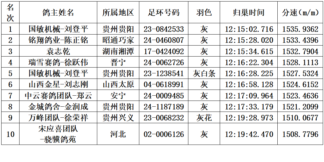 云南石林宇松赛鸽中心春棚400公里决赛成绩TOP10