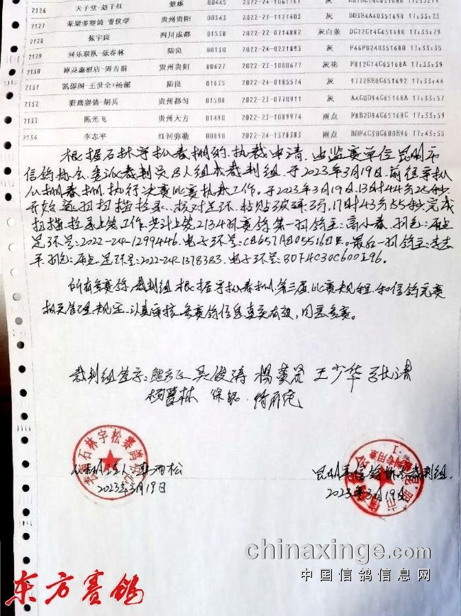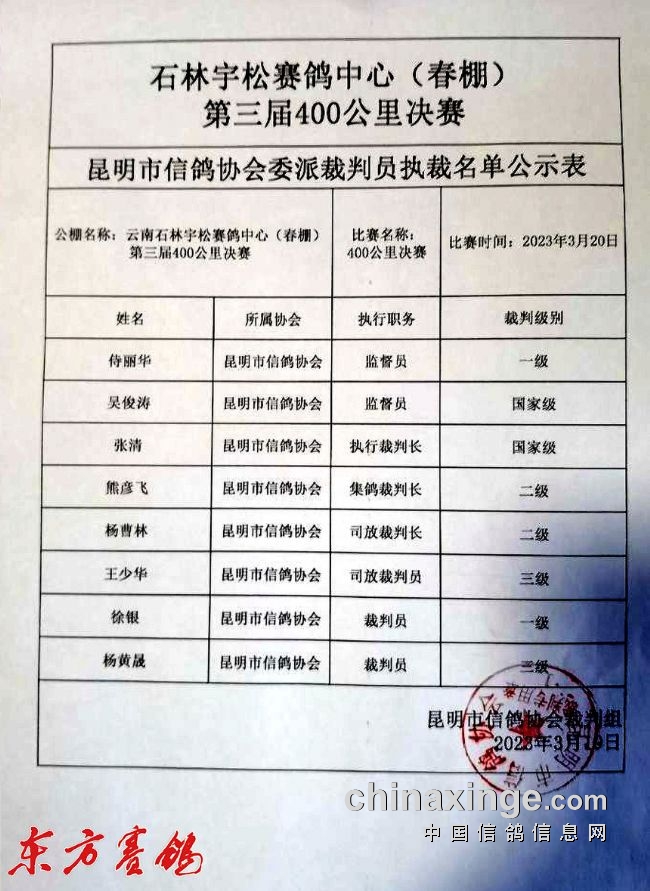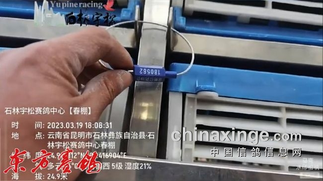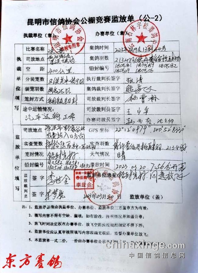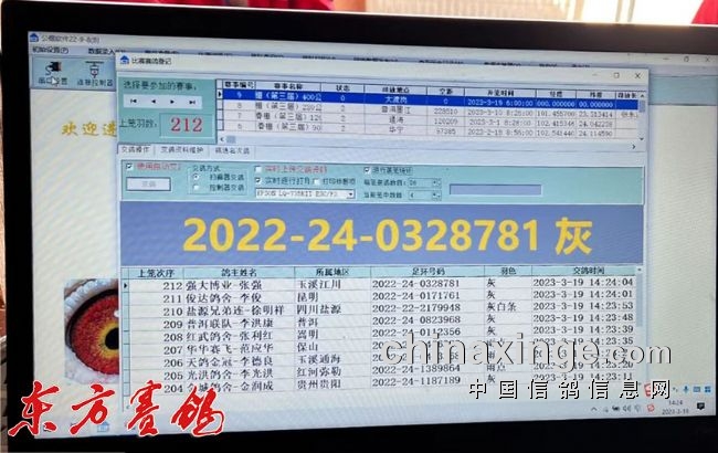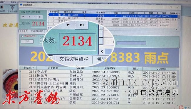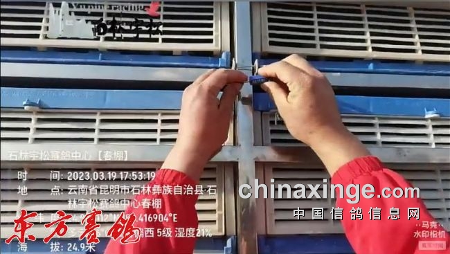 集鸽:3月19日集鸽,昆明市信鸽协会派出8名裁判执裁,由国家级裁判张清担纲执行裁判长,熊彦飞任集鸽裁判长,杨曹林任司放裁判长。集鸽于13:44:25开始,对每一羽赛鸽逐羽扫描行足环、核对羽色、贴易碎贴封环,至17:45顺利完成集鸽工作,共计有效上笼2134羽。给一羽电子环损坏的赛鸽更换了新环。夕阳西下时,赛鸽车载着宇松赛鸽大军缓缓驰出公棚大门,奔赴美丽的西双版纳州景洪市大渡岗乡。