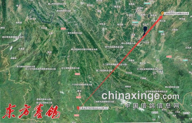 地理:景洪市在横断山系纵谷区南端,地处澜沧江大断裂带两侧,具山原地形,北高南低,两侧高,中部低,山峦叠嶂,沟壑纵横。最高海拔2196.8米,最低海拔485米。景洪市是云南省西双版纳傣族自治州的首府,那里的傣寨“竹楼映蓝天,湖水围绕竹楼旁。妩媚傣寨水,炊烟缭缭绕山岗”,景色迷人。赛鸽从野象谷北收费站入口处启航,飞越翠绿的万亩茶园,穿山峦叠嶂,沟壑纵横的横断山系纵谷区,过墨江境内2000—3000米山高谷深的哀牢山脉中段,一路向北(东北)到公棚所在地石林,沿途大多是山区半山区,赛线地理环境对赛鸽飞行有极高难度。