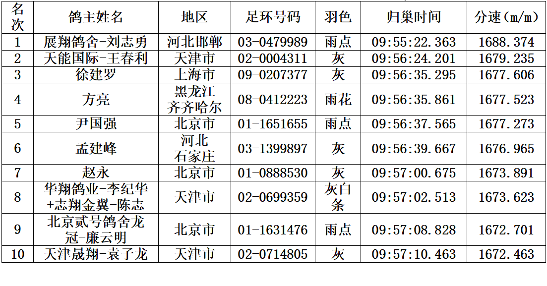 在前十名排行榜上,天津和北京鸽友各占据三席,河北占据两席,上海和黑龙江各占据一席。四省市鸽友分享前十名。