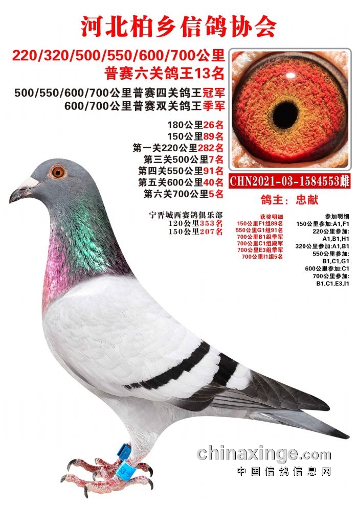 21年春赛:宁晋城西赛鸽俱乐部千公里9名;普赛240公里冠军、9名、19名;300公里季军、5名、15名;480公里冠军、季军、9名;500公里冠军、季军、6名、特比环9名。