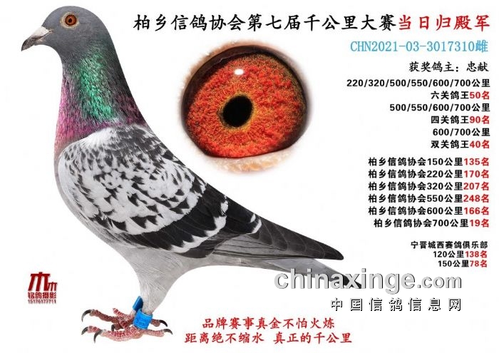 2019年春千公里菲凡鸽舍当天归巢的29名、61名,是老三名的直子作出,忠献获得柏乡鸽会春季特比环三关综合总冠军、23名、30名、38名、68名、71名、86名、88名、团体冠军。2019春季千公里,鸽友忠献当天归68名、74名、76名,均是老三名的血统。2023年千公里,再度斩获当日归4名、5名、千公里50名。