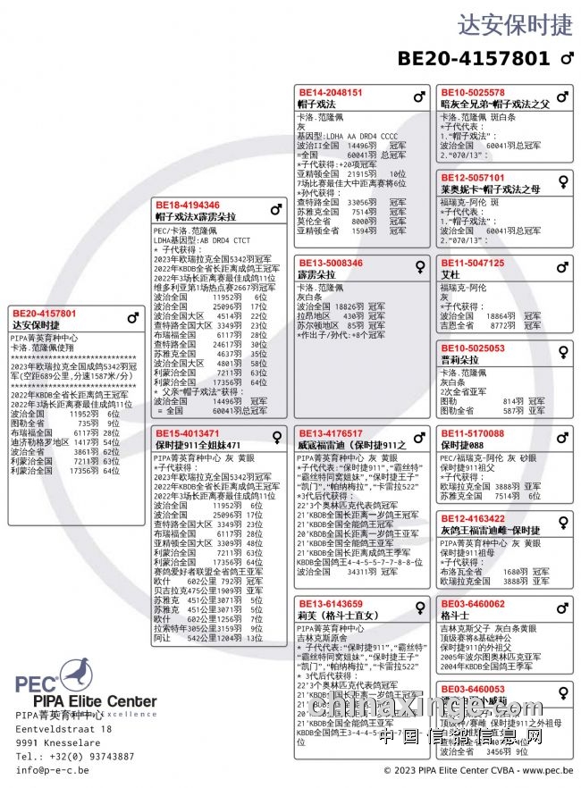 成鸽组冠军则被卡洛·范隆佩(VAN ROMPAEY KARLO)的一羽BE-20-4157801拿下,这羽赛鸽15:44完成打钟,空距为689.092公里,平均分速为1587.16 米/分,荣登成鸽组5342羽冠军、11854羽总排名3名。冠军鸽父亲是范隆佩的“帽子戏法”直子,母亲是“保时捷911”全妹。值得一提的是,卡洛·范隆佩在本次比赛中前十进四,前百进九,分别斩获11854羽总排名的3名、4名、7名、9名、11名、18名、42名、48名、75名、167名。