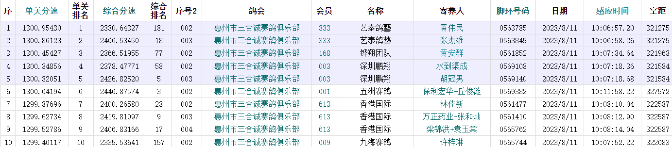 进入八月,多地还处在换羽时期,广东惠州三合诚赛鸽俱乐部秋赛首关便早早开打,上笼四千当日归八成,战况十分激烈,虽然有高温酷热影响,但整体归巢成绩不凡。