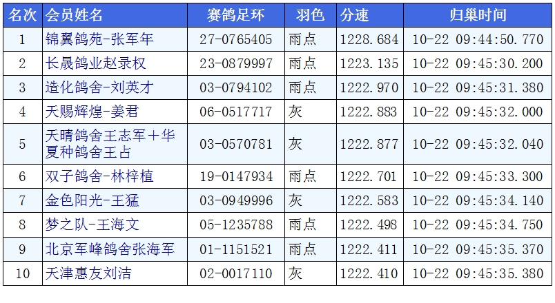 贵州鸽友长晟鸽业赵录权名下的雨点,环号23-0879997,于2023-10-22 09:45:30.200归巢,分速1223.135米/分,摘取榜眼。