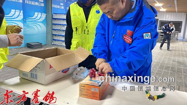 裁判员对鸽车铅封,并展示铅封条。