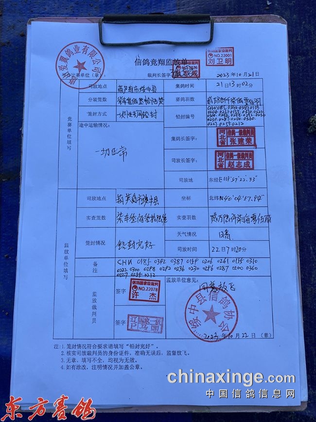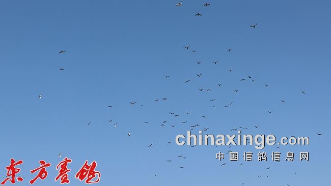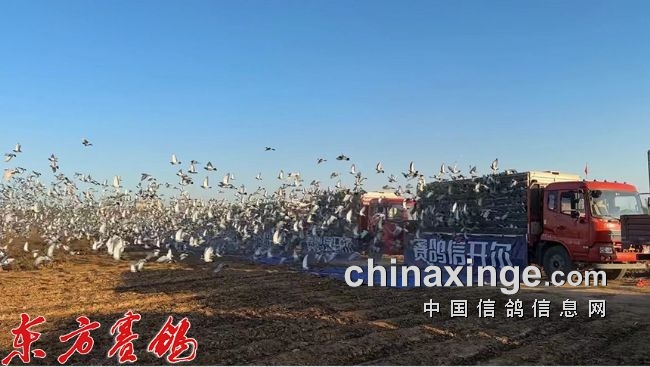 10月22日清晨,辽宁省绥中县的一处田野上,阳光明媚,11辆司放车严阵以待,大棚4辆于7点整先开笼放飞,7点20分,司放长一声令下7辆放飞车同时开笼,26705羽赛鸽训练有素的青年队小鸽子争先恐后飞出鸽车,一时间遮天蔽日、十分壮观,鸽子在天空稍作盘旋分成二队便向西边的家飞去。