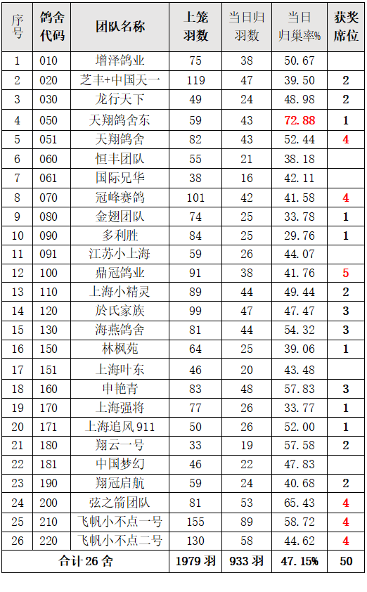 在当日各团队成绩统计表中,鼎冠鸽业以入赏5羽排名入赏榜单第一,天翔鸽舍、冠峰赛鸽、弦之箭团队、非凡小不点一号和非凡小不点二号以入赏4羽紧随其后,并列入赏榜第二。