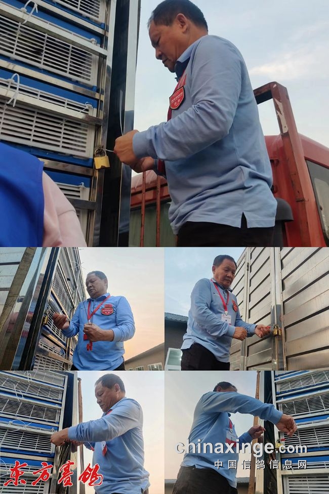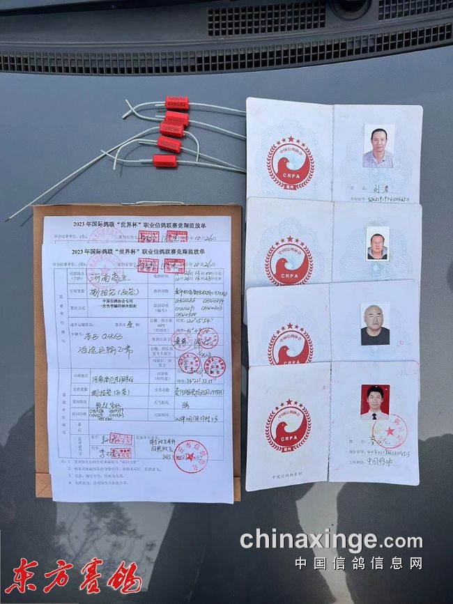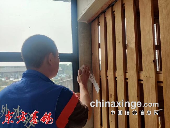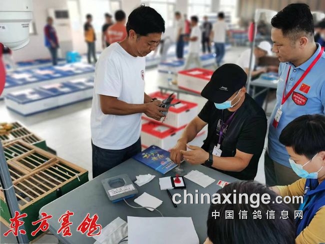 裁判员对鸽车进行铅封上锁,并展示铅封条。