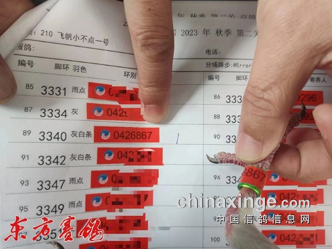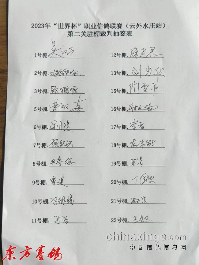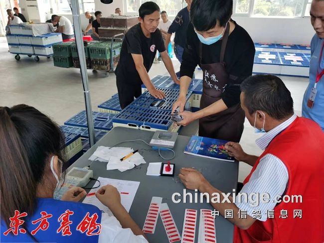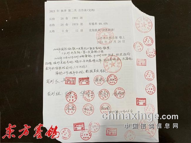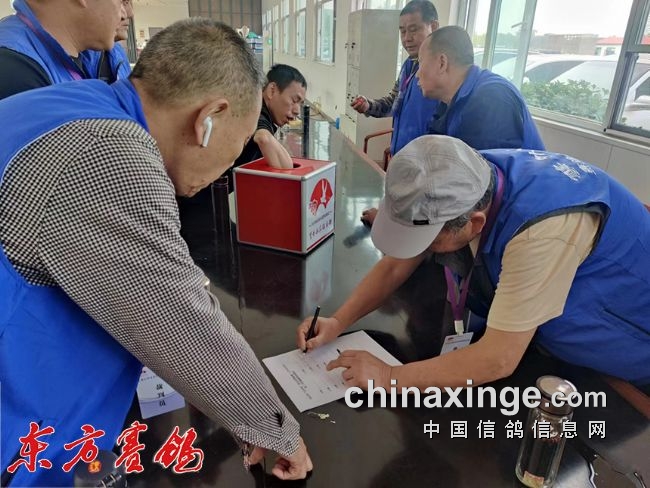 裁判组确认集鸽单。云外水庄第二关26舍集鸽1979羽。