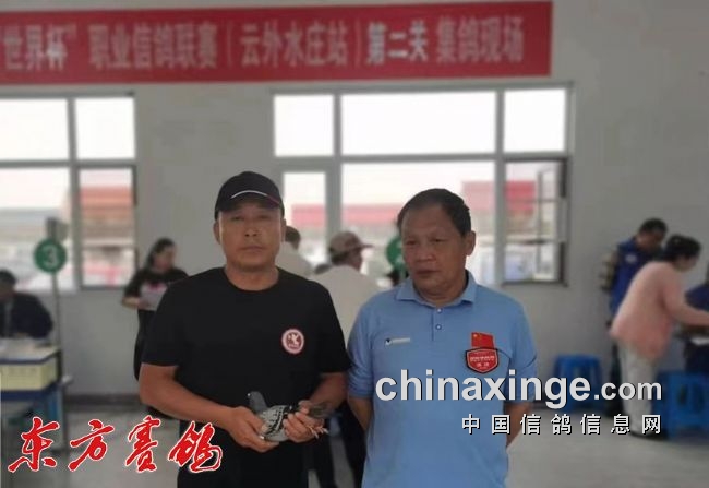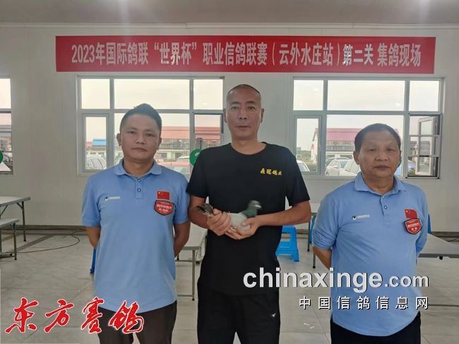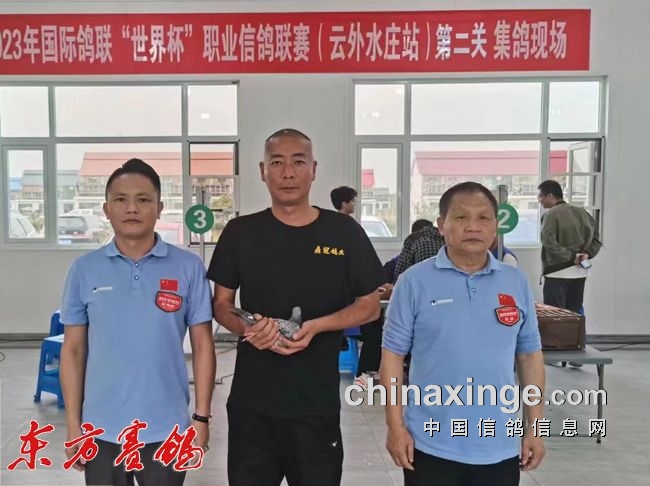 裁判长吴海彪(左)副裁判长游建(右)和冠军鸽教练合影。