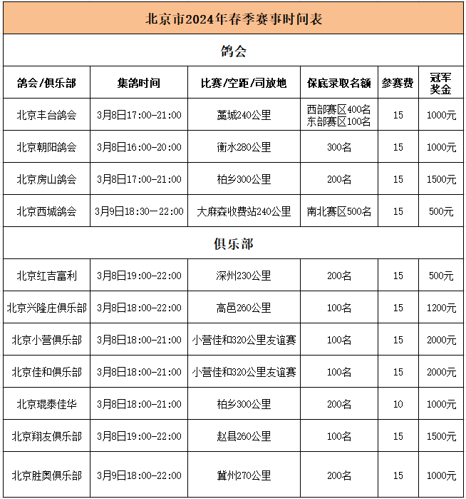以下是部分赛事时间表汇总,仅供参考,请以鸽会俱乐部最新公告为主: