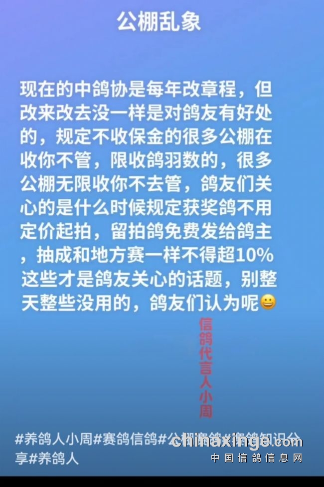 在手机上看到个短篇“檄文”,一针见血地揭示了公棚目前存在的一些乱象和鸽友的述求,现实公棚赛事存在的问题还不止这些。要等到什么时候,又有谁去拨乱反正呢?