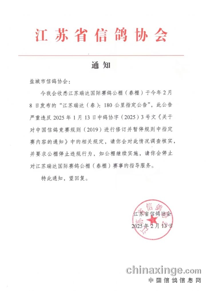 江苏瑞达春棚: 根据江苏省信鸽协会指示,瑞达春棚180公里附加赛暂停。所收款项将在3个工作日内退还给参赛会员。后续比赛将在附加赛项目及形式上进行优化,具体细则将在赛前发布。