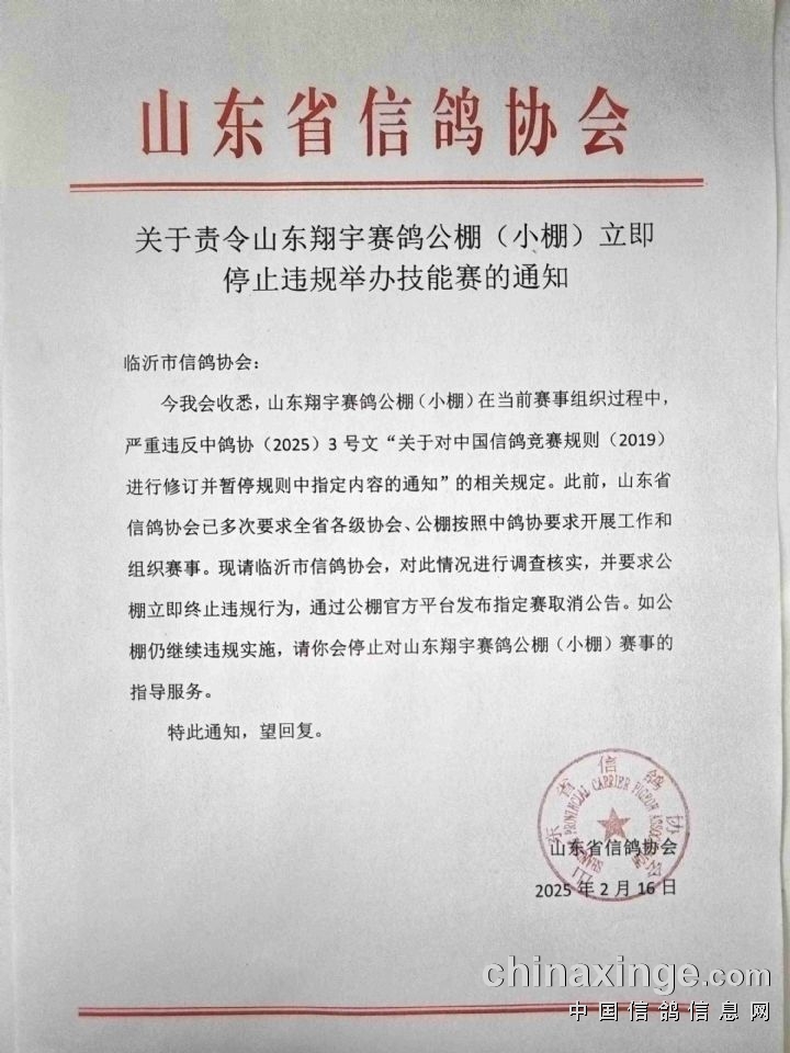 根据山东省信鸽协会指示,山东翔宇春棚(小棚)180公里单羽赛暂停。所收款项将在3个工作日内退还给参赛会员。后续比赛将在附加赛项目及形式上进行优化,具体细则即将发布。
