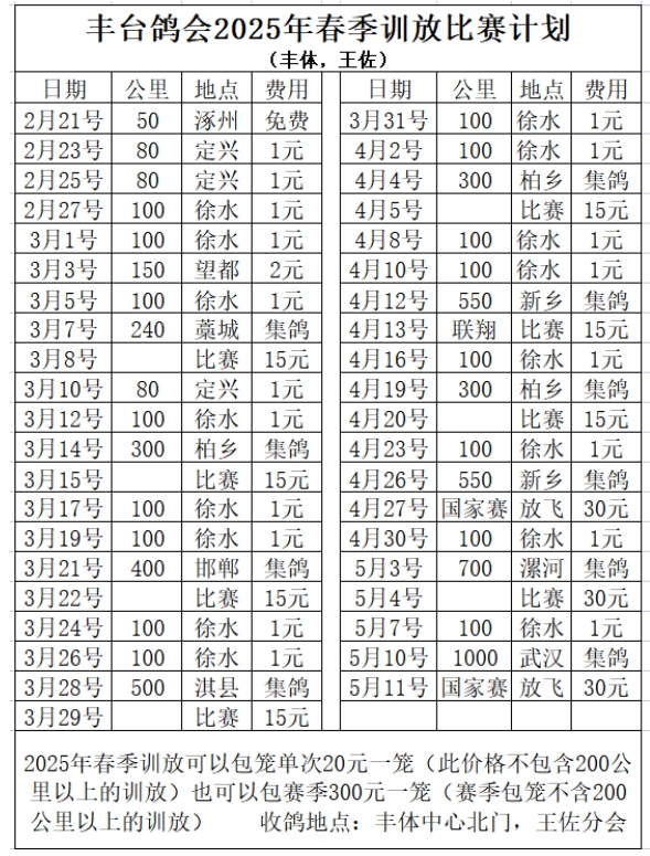 冬去春来,各地天气逐渐转暖,鸽会也纷纷公布了2024年春赛计划。继朝阳鸽会后,北京丰台鸽会也启动了春赛进程,首场240公里短距离赛3月7日开始打响,一个月内连打四场比赛。