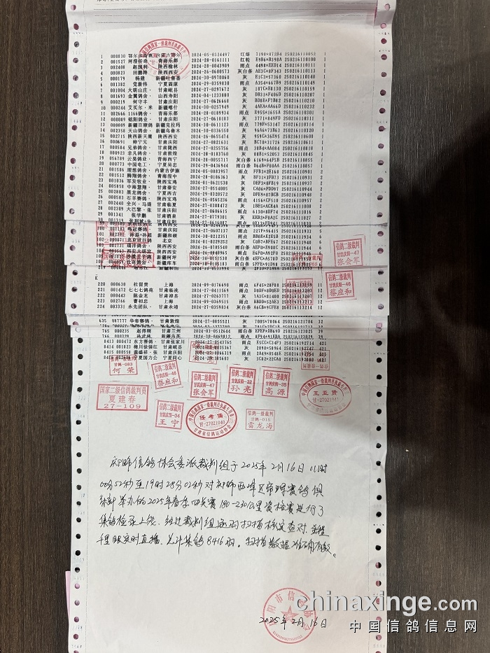 本届春棚赛设参赛费每羽2800元,其中500-530公里决赛取前1000名,奖励冠军80万元、亚军30万元、季军20万元。由庆阳市信鸽协会委派裁判组于2025年2月16日11时00分52秒至19时28分02秒对庆阳市西峰区帝珲赛鸽俱乐部举办的2025年春季四关赛180-230公里资格赛进行了集鸽检录上笼,经过裁判组逐羽扫描核实查对,全程使用千里眼实时直播。
