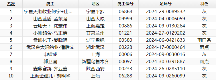 甘肃兰州小刚鸽舍-马正清获4名、辽宁盘锦雪迪化工-晏晓明获5名,纵观前十,宁夏本地鸽友仅占一个名额,看来竞争确实激烈。