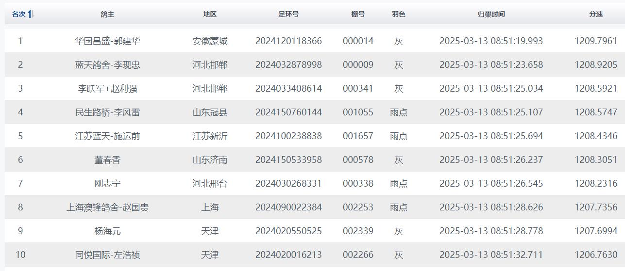 8点51分见鸽,一分钟内进棚34羽。华国昌盛-郭建华的2024120118366灰鸽率先进棚,以1209.7961米/分的速度一举拿下冠军!蓝天鸽舍-李现忠的2024032878998灰鸽稍落其后,以1208.9205米/分的速度获得亚军。2秒后,季军被李跃军+赵利强的2024033408614灰鸽摘得,分速1208.5921米/分。截至9点28分,已有9600多羽顺利到达,期待更多小将归巢。