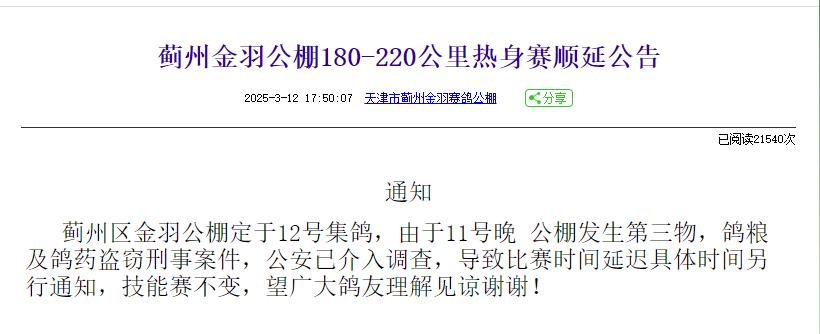 因3月11日晚蓟州金羽公棚发生第三物,鸽粮及鸽药盗窃刑事案件,次日晚(12日17点50分)公棚在官网发布180-220公里热身赛顺延公告。目前,公安部门已介入调查。比赛时间延迟具体时间将另行通知,技能赛不变。