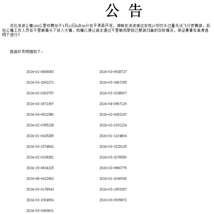河北凌波赛鸽公棚100公里收费站于3月12日08点56分在山东省平原县开笼,共集鸽11933羽。10点22分首羽赛鸽归巢,是天津鸽友飝龙鸽业-贾乃康的2024-02-0203764雨点,飞行分速1218.4506米/分。截至下午两点,归巢率达八成。 当晚,公棚发布公告,说明“傍晚在凌波湖边发现27羽饮水过量无法飞行参赛鸽”,并将这些赛鸽放入棚中。以下是公棚公告: