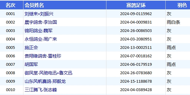 归巢消息:09:36,大批量赛鸽开始归巢,刘继来+刘振兴的2024-09-0115962灰,飞行分速1286.6357米/分获得冠军;晨宇鸽舍-李治国的2024-04-0009831雨白条获得亚军;锦阳鸽业-魏军获得季军。