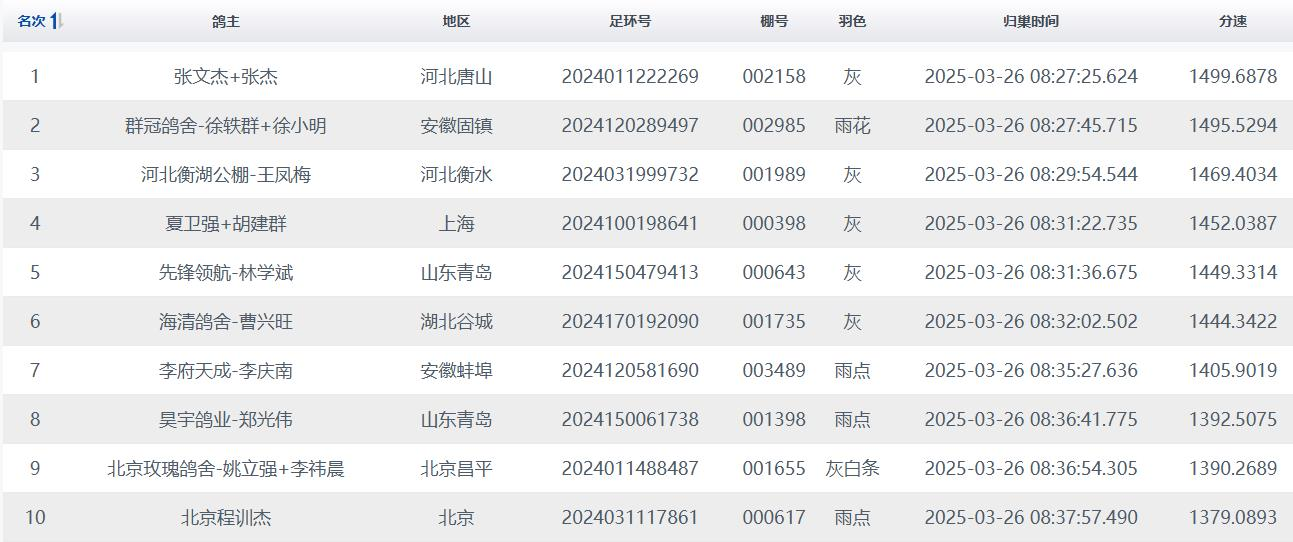 8点27分,两羽赛鸽率先抵达。鸽友张文杰+张杰名下的2024011222269灰鸽勇夺头名,分速为1499.6878米/分。群冠鸽舍-徐轶群+徐小明的2024120289497雨花紧随其后,以1495.5294米/分的分速位列第二。两分钟后,河北衡湖公棚-王凤梅的2024031999732灰鸽以1469.4034米/分的分速获第三名。截至26日17点20分,已有6800多羽小将归来,归巢率超七成。