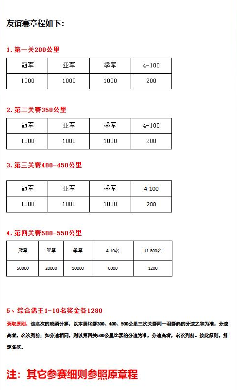 之后,公棚于3月24日开启80公里收费站,5410羽赛鸽在江苏省南通市如东县迎来放飞,截至目前归巢羽数4005羽,归巢率超七成。据悉,2025年为上海蓝色海湾首届春棚赛事,收鸽20899羽,参赛费每羽为2000元。设四关赛,第四关决赛录取800名,前三名依次奖励50万、30万、10万。