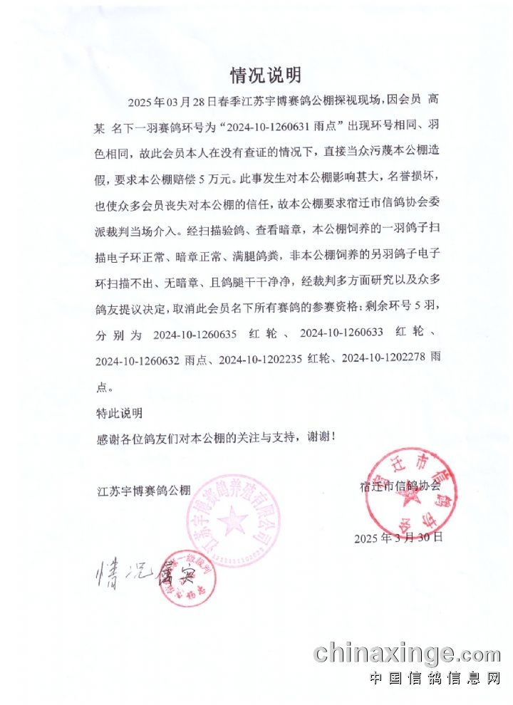 随后,3月30日下午16点,江苏宇博赛鸽公棚关于28日探视情况再次进行说明。现场探视时,一位鸽友提出异议,原因是其名下一羽赛鸽环号为“2024-10-1260631雨点”出现环号和羽色相同的情况。宿迁市信鸽协会委派裁判当场介入,经扫描验鸽、查看暗章,公棚饲养的这羽鸽子并未出现异常。裁判多方面研究以及鸽友提议决定,取消此会员名下所有赛鸽的参赛资格(共计六羽)。