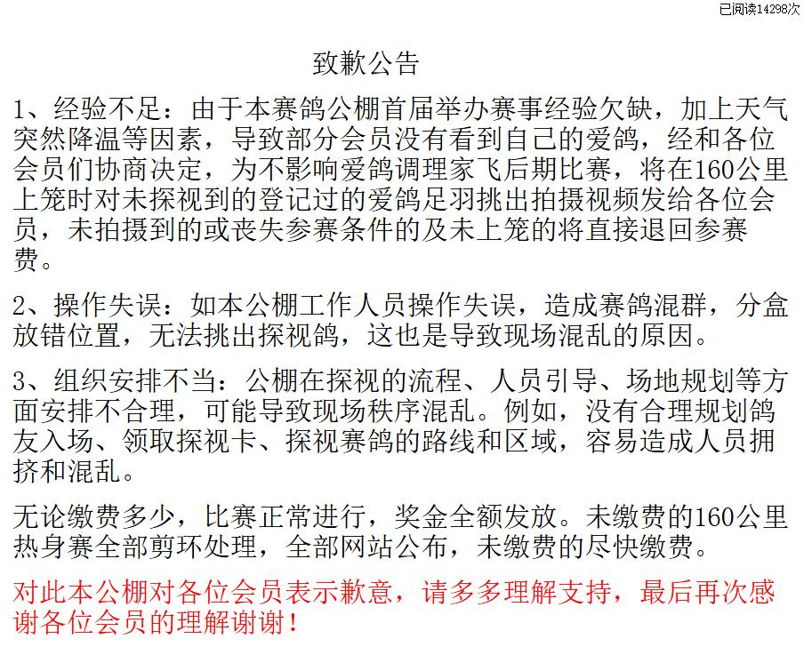 3月24日,江苏宇博春棚发布2025年探视及交费公告。现场探视时间为3月28日早8点-下午4点,仅限一天。就在探视当日晚22点,公棚发布一则致歉公告,对于探视现场混乱以及会员无法正常探视自己爱鸽一事进行致歉和说明。“由于公棚首届举办赛事经验欠缺,组织安排不当,公棚工作人员操作失误,再加上天气突然降温等等原因,导致会员无法进行正常探视。经协商,未拍摄到的或丧失参赛条件的及未上笼的将直接退回参赛费。”