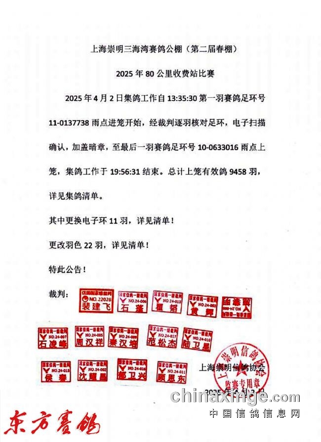 上海三海湾赛鸽公棚春赛80公里收费站成绩TOP10