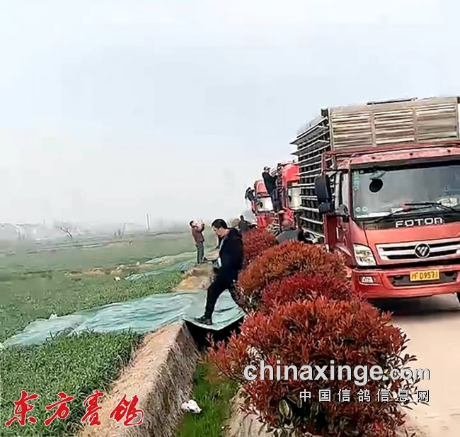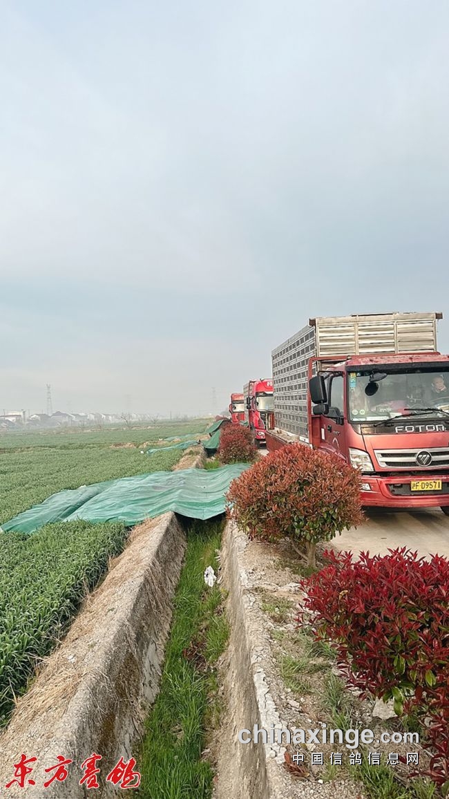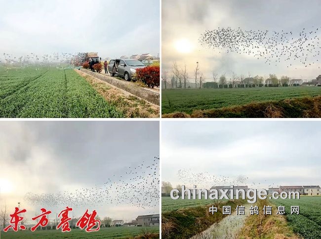 放飞:在南通市通州区一片绿色的麦田傍,三辆赛鸽车一字排开。7点3分,赛鸽车依次开笼,赛鸽喜悦地飞上蓝天,在空中化成一条长龙,朝着美丽的崇明岛鸽的家快速归去。