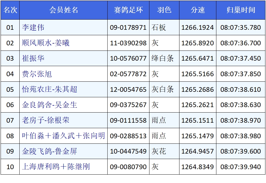 上海鸽友李建伟麾下09-0178971石板于08:07:35.78踏响鸽钟,成为收费站的状元郎,分速为1266.1924米。