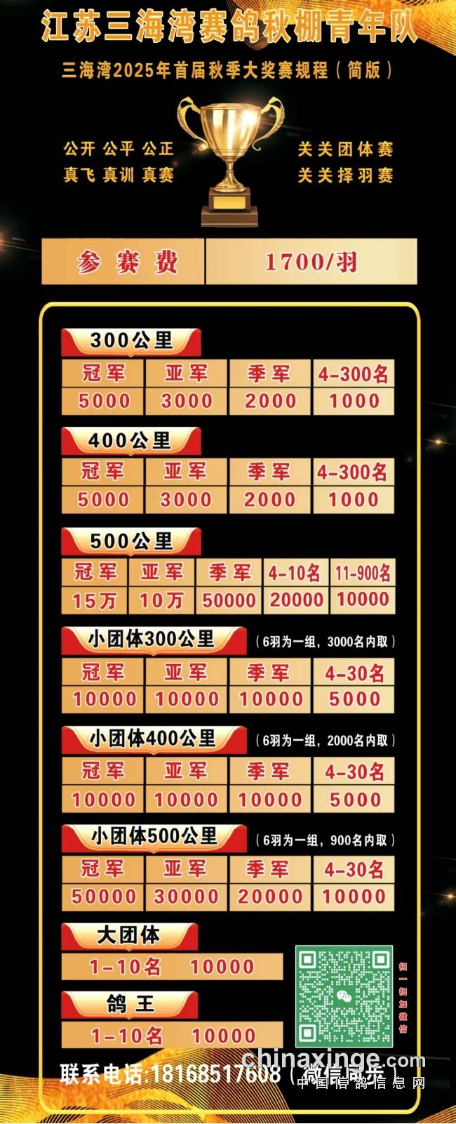 三海湾青年队秋棚奖励与众不同、别出心裁,颇有亮点:一是奖励范围广,300公里、400公里各奖300名,500公里奖励900名。二是小团体关关有团体奖,取奖30名。参赛费低取奖面广的设计,很适合广大工薪阶层鸽友参赛。