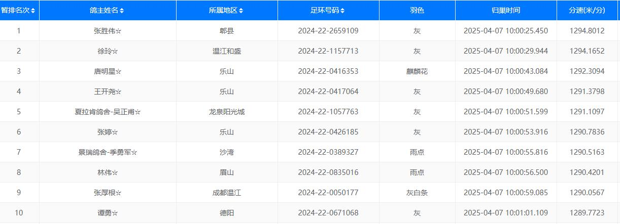 两个多小时后见鸽,首羽顺利归来。张胜伟☆的2024-22-2659109灰鸽率先踩钟进棚,以1294.8012米/分的速度夺冠。4秒后,徐玲☆的2024-22-1157713灰鸽以1294.1652米/分的速度拿下亚军,季军则被唐明星☆的一羽麒麟花摘得,足环号2024-22-0416353,分速为1292.3094米/分。截至11点55分,已有4500多羽小将凯旋,归巢率近八成。