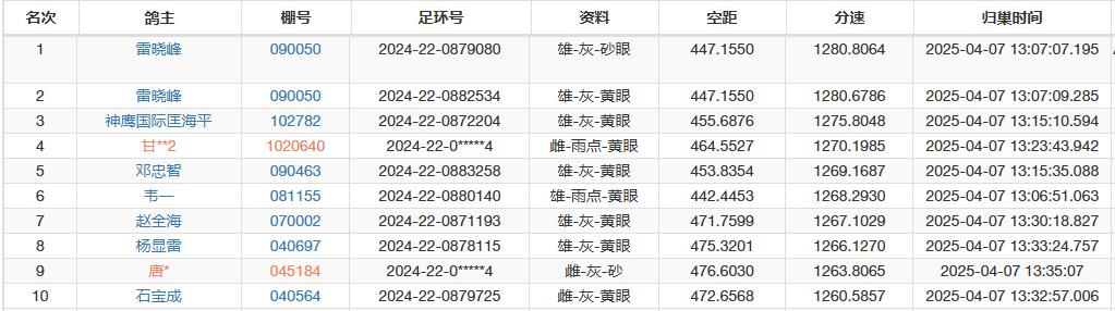 8分钟后,神鹰国际匡海平的2024-22-0872204黄眼灰雄,以1275.8048米/分的速度获得第三名,空距455.6876公里。据成都信鸽协会官方统计,共计归巢5818羽。