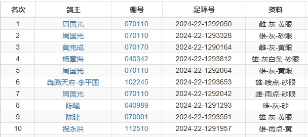 成都名家周国光的2024-22-1292050黄眼灰雌,于14:33:04报进,飞行空距583.4385公里,分速1249.1397米/分,拿下了本关首金。除冠军外,周国光的另三羽2024-22-1293328、2024-22-1292064、2024-22-1292042分别拿下亚军、5名、7名。冠亚通杀,前十进四羽,姜还是老的辣!