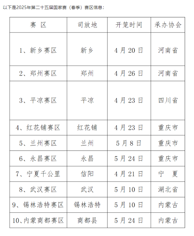 据统计,春季赛事共设十个赛区,涵盖备受瞩目四川平凉大赛、新乡国家赛、郑州国家赛及武汉国家赛等。本届春季国家赛的比赛时间集中在四、五月,最晚至5月24日,届时各大赛区将逐一展开激烈的角逐。值得注意的是,本届并未举行超长距离赛事,空距止步于1100公里,赛事更加聚焦于速度战。