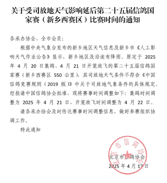 4月17日,北京市协会发布公告:根据中央气象台发布的新乡地区天气信息及新乡市《人工影响天气作业公告》显示,新乡地区及沿途有降雨,司放地天气不符合《中国信鸽竞赛规则(2019版)》中关于司放地气象条件的具体规定,将2025年国家赛春季新乡赛区比赛时间调整为4月21日集鸽、4月22日开笼放飞。