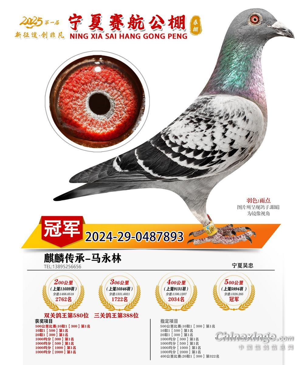 宁夏赛航500公里决赛,摘得决赛桂冠的是宁夏吴忠麒麟传承-马永林麾下的2024290487893雨点,分速为1328.2850米/分。这次决赛前半程风力较小,后半程全程顶风4-5级,最后冲刺难度很大,这羽雨点最后以一千三百多的分速夺冠,证明它超高的飞行技巧与强大的肌肉力量,足见实力了得。
