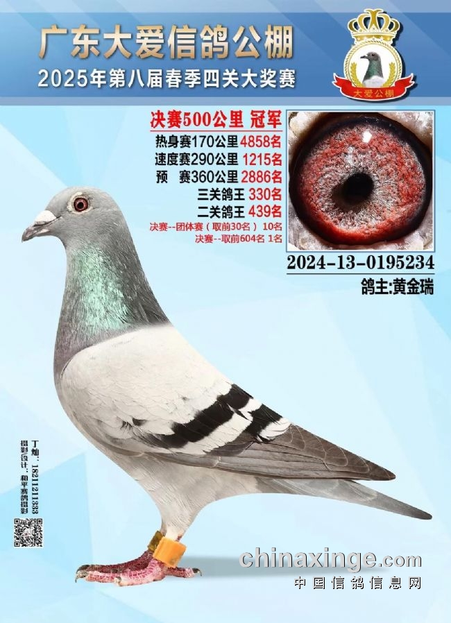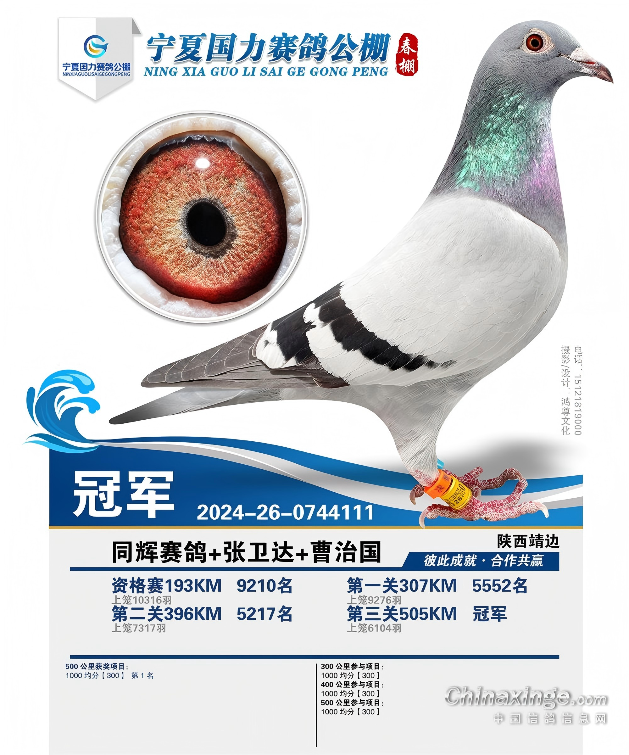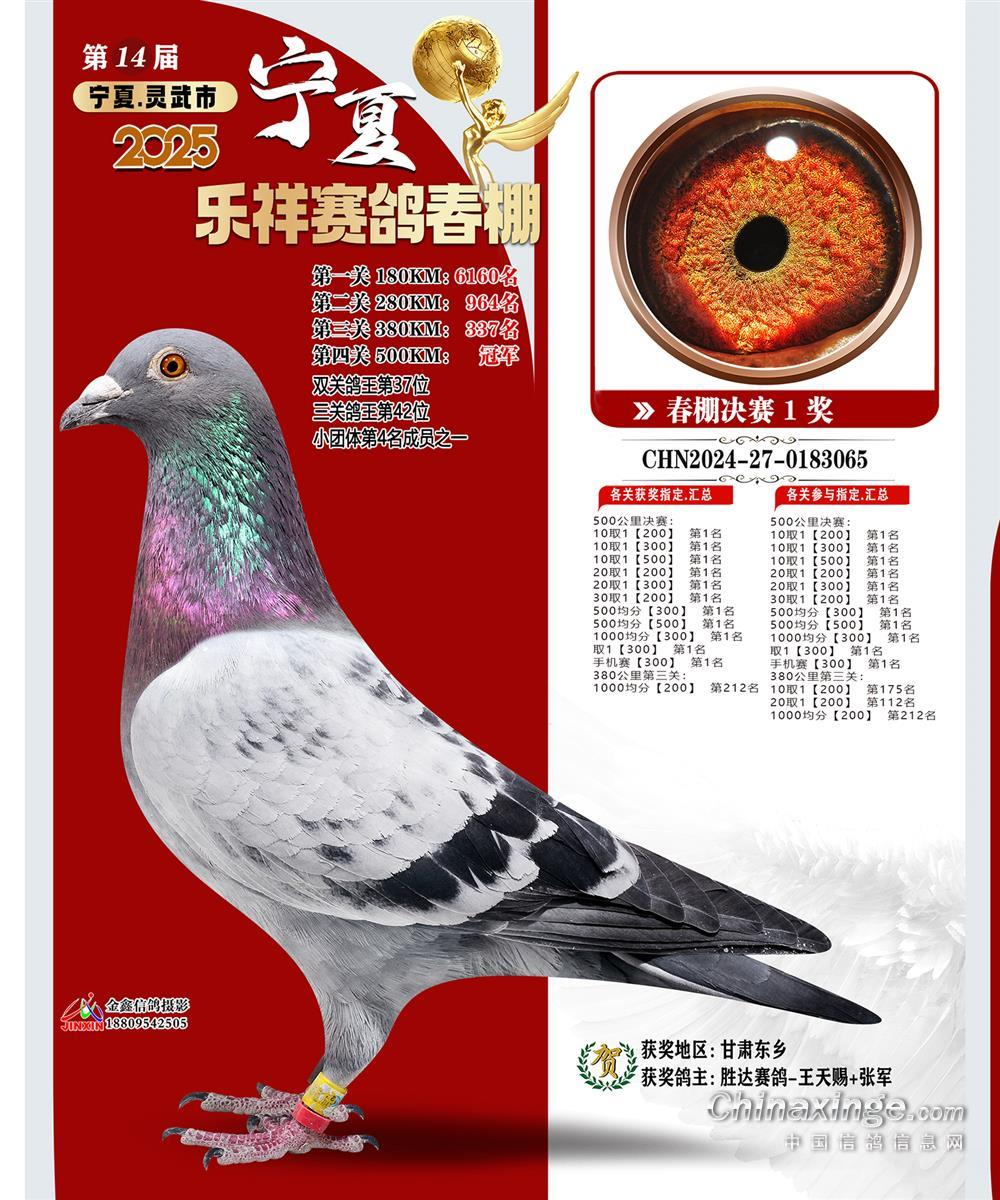 宁夏国力春赛决赛冠军,由同辉赛鸽+张卫达+曹治国麾下猛将2024260744111灰白条拿下,分速高达1751.4284米/分。从资格赛稍显落后,到一关表现平平,二关略有进步,决赛一飞冲天、惊艳全场,很显然这是一羽厚积薄发的“隐藏高手”。