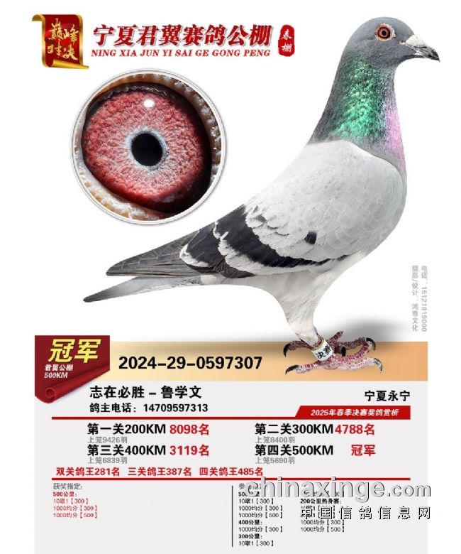 以上是宁夏与广东今年春棚的决赛冠军,为这些精英冠军喝彩。宁夏今年还有两家公棚举办了千公里挑战赛,牵动众多鸽友的心,一起来欣赏千公里挑战赛冠军的风采。