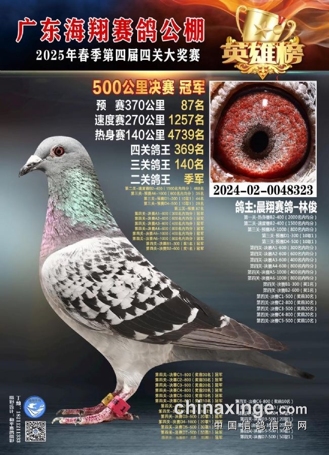 广东海翔2025年春季第四届四关大奖赛,冠军鸽2024-02-0048323,鸽主晨翔赛鸽-林俊只交一羽参赛,单枪匹马拿冠军。一关热身赛4739名,分速491.8648米/分;二关速度赛1257名,分速774.3857米/分,三关预赛87名,分速1219.9042米/分,四关决赛冠军,分速1318.8245米/分。还拿下二关鸽王季军,一关更比一关快,冠军的成长之路就是这么孤独又惊艳!