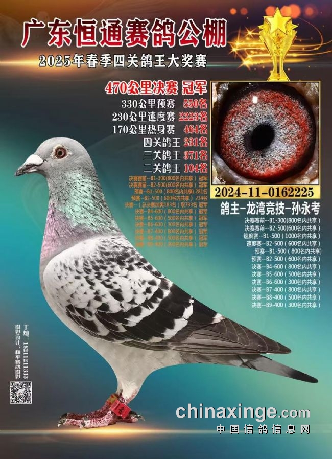 2025年广东恒通春棚大战四关,决赛冠军来自浙江温州名家龙湾竞技-孙永考。一关9811羽赛鸽飞464名稳稳当当,二关飞2223名不慌不忙,三关飞550名正常发挥,四关决赛500公里直接发力冲第一。羽色:雨点,环号:2024-11-0162225,决赛分速:1170.1285米/分。还获得二关鸽王104名,三关鸽王371名,四关鸽王231名,实力不用多说。