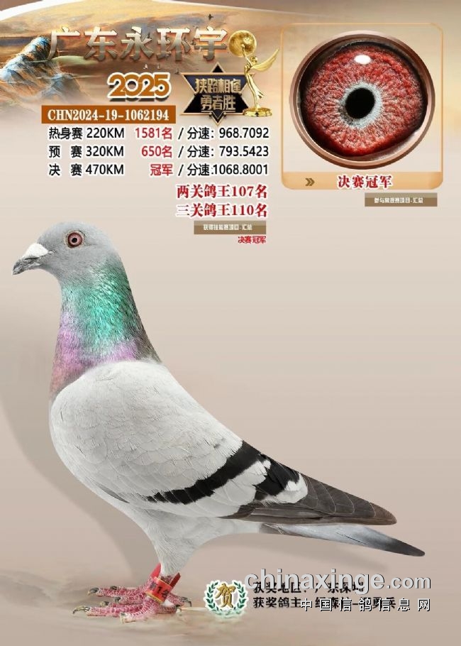 2025广东永环宇赛鸽公棚春季三关2月就已打响。决赛冠军由来自深圳的鸽友绿森林-柳勇兵的一羽灰鸽2024-19-1062194获得。热身赛上笼7千多羽,排名1581名,面对2~3级顺风,分速968.7092米/分的成绩以为是陪跑,二关展现坚强韧性在淘汰过半的预赛中获得650名。决赛以1068.8001米/分的分速成功逆袭获得冠军!
