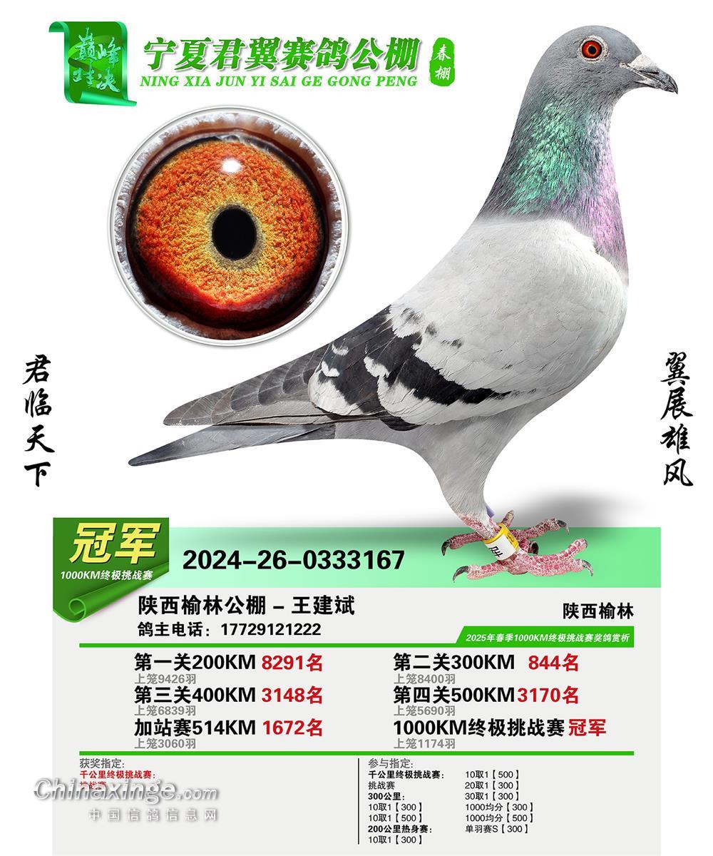 4月20日宁夏君翼公棚千公里大赛开笼,第二天上午9时06分,一羽足环号2024260333167的灰色战将冲破云霄,以983.8084米/分的惊人分速强势归巢!这羽来自陕西榆林公棚-王建斌麾下的勇士,在开笼次日早晨便完成千公里壮举,用自己的耐力与超高的飞行技巧直面黄土高原的沟壑纵横、西北气流的剧烈扰动,以及昼夜温差近20℃的严酷考验,在贺兰山脚下书写了千公里赛鸽的新传奇!